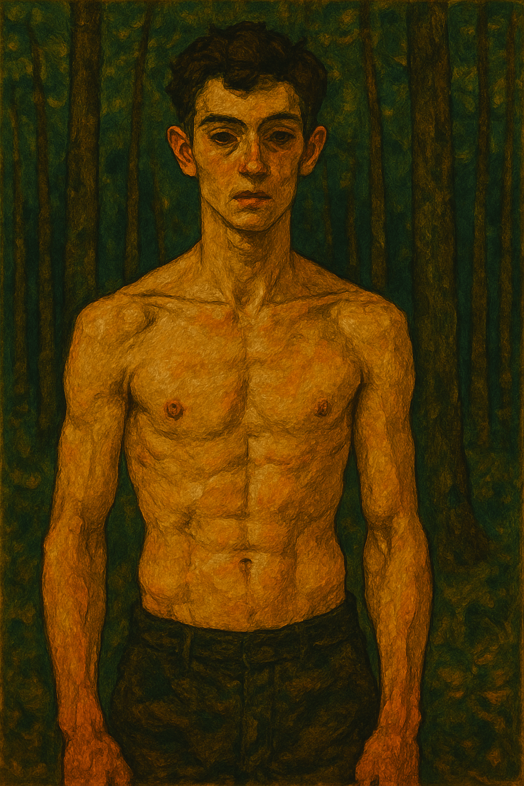 Lo vi apenas doblé la primera curva del sendero. Estaba de pie en el sitio donde la luz caía en un ángulo preciso, extendiéndose sobre su pecho. La piel morena clara recibía ese brillo con una suavidad que me obligó a bajar el paso. Su respiración lenta hacía que la luz avanzara y retrocediera sobre él, revelando el músculo marcado, la forma exacta en que sus pezones se alzaban con una tensión mínima. Me quedé mirando ese vaivén luminoso, atrapado por cada pulsación de la luz sobre su pecho. Sentí la sangre reunirse en el bajo vientre, un oleaje tibio, lento, que me empujó medio paso hacia él, atraído por la manera en que su piel retenía la tarde, como si la luz quisiera quedarse ahí un segundo más antes de deslizarse.